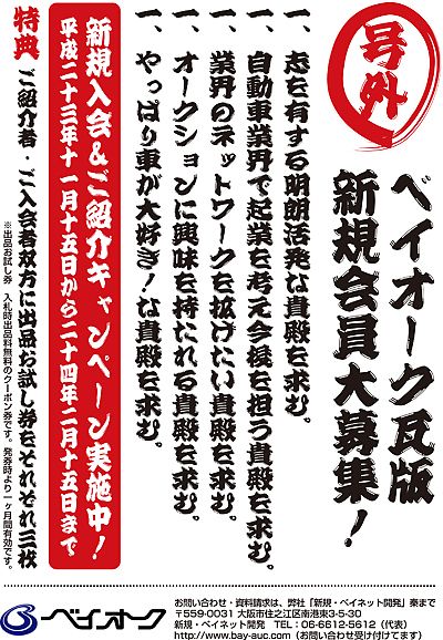 ベイオーク(塩原淳平社長、大阪市住之江区)は15日から、「オークション体験・ベイネット無料お試しキャンペーン」と「新規入会&紹介キャンペーン」を同時展開する。期間は年末年始をはさむ来年2月15日まで。無料お試しや紹介などを通じ、新規会員増...