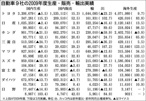 自動車メーカー各社は26日、2009年度の生産・輸出・販売実績を発表した。昨年度は08年秋に起きた経済危機の影響が上半期を中心に色濃く出たが、早い段階で危機の影響から抜け出した中国、インド、東南アジアなどで現地生産が拡大。8社中6社が海外...