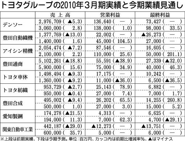 トヨタ自動車グループの部品・車体メーカー8社は28日、2010年3月期連結決算を発表した。トヨタの生産は回復傾向にあるものの、特に年度上半期での不振などが響き、売上高は全社が減収となった。ただ、固定費の削減や合理化努力など収益改善に取り組...