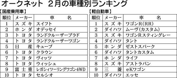 オークネット(藤崎清孝社長、東京都千代田区)は、2010年2月度のインターネットテレビオークションのタイプ別成約台数ランキングをまとめた。 それによると国産車部門は、「スイフト」が3カ月連続で1位となった。同車は出品/成約ポイントともに部...