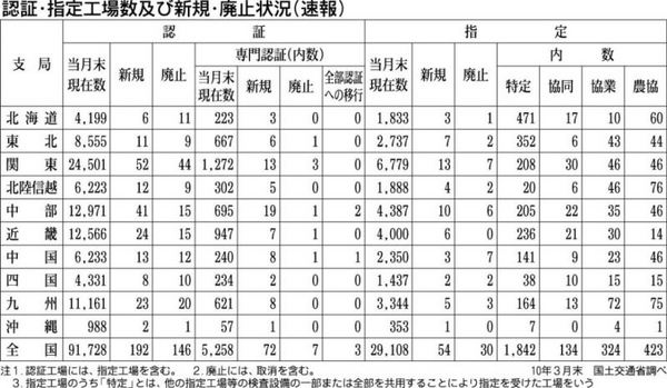国土交通省は、2010年3月末までの認証、指定、認定工場数および新規・廃止、専門認証の取得状況をまとめた。 認証工場は9万1728工場で対前月比44工場増となり、2カ月連続の増加。指定工場は4カ月連続で増加し、前月比22工場増の2万910...