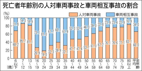 【提言2】 交通事故による死亡者年齢を人対車両事故と車両相互事故の割合で比較すると、人対車両が66%を占めている。特に65歳以上における割合が高く、65歳以上の高齢者はどの年齢層でも75%を上回っている。特に、歩行中の死亡事故が最も多い。...