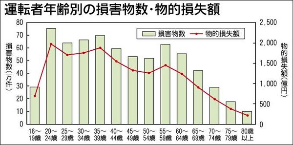 【提言4】 運転者の年齢別に損害物数と物的損失額をみると、20~24歳の年齢層を頂点に、年齢が増加するとともに減少している。また、免許保有者1万人当たりでみると、16~19歳の年齢層が突出している。このため、若年運転者への予防安全対策が必要...