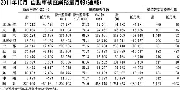 国土交通省は、2011年10月の自動車検査業務量(速報)をまとめた。全国の新規検査件数は前月比6万9961件減の32万9026件、継続検査件数は同18万521件減の176万1453件となった。指定整備率は同0・6ポイント減の74・0%。構...