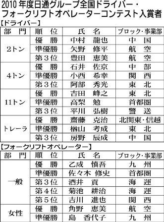 日本通運はこのほど、日通伊豆研修センター(静岡県伊豆の国市)で「2010年度日通グループ全国ドライバー・フォークリフトオペレーターコンテスト」を開催した。グループにおける作業力全般の高品質化とローコスト化、環境負荷低減の推進を目的に03年...