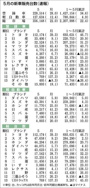 5月の新車販売(登録車と軽自動車の合計)台数は35万6148台となり、前年同月比で22・0%のプラスとなった。金融危機前の2008年5月との比較では1・2%のマイナスとなったが、一昨年実績との減少幅は前月の4・4%から3・2ポイント改善し...