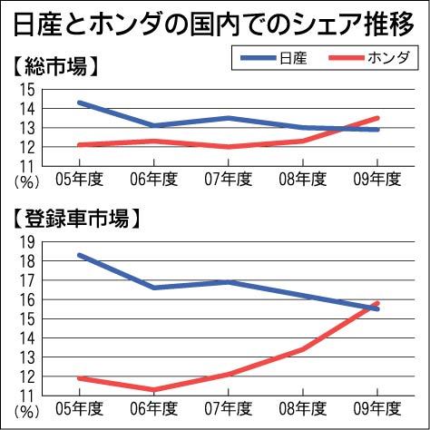 9月末にエコカー補助金制度が終了する国内市場で日産自動車とホンダの競争が激しくなりそうだ。ホンダは2009年度に登録車の市場シェアが日産を抜き初の2位になった。軽自動車を含む総市場でも08年度の5位から2位に一気に上昇した。日産はハイブリ...