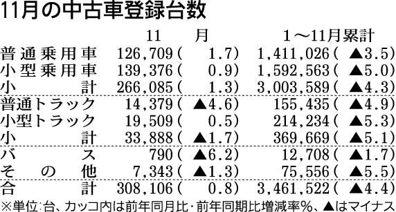 日本自動車販売協会連合会が12日発表した11月の中古車登録台数は、前年同月比0・8%増の30万8106台と、半年ぶりにプラスへ転じた。新車販売の回復で下取車が増えたことが要因と見られる。ただ通年では、12月が前年並みとしても377万台程度...