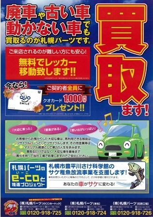 あなたの車がサケに変わる! 札幌パーツ(大熊薫社長)は社会貢献活動として、廃車などの買い取り1台につき100円をサケの稚魚放流事業に寄付する。 「e―CO(いーこ)と推進プロジェクト」の一環として展開中。札幌市豊平川さけ科学館が飼育する稚...