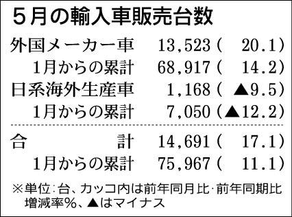 日本自動車輸入組合(JAIA、ローランド・クルーガー理事長)が4日発表した5月の輸入車新規登録台数は、前年同月比17・1%増の1万4691台で7カ月連続の前年超えとなった。5月の過去最高実績(1996年の3万1378台)の5割程度にまで戻...