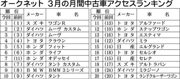 オークネット(藤崎清孝社長、東京都千代田区)は中古車情報支援サイト「オークネット・jp」の2010年3月度の車名別アクセスランキングベスト20をまとめ、発表した。 3月は全体的に動きは少なかったものの、比較的大型なミニバンが順位を上昇させ...