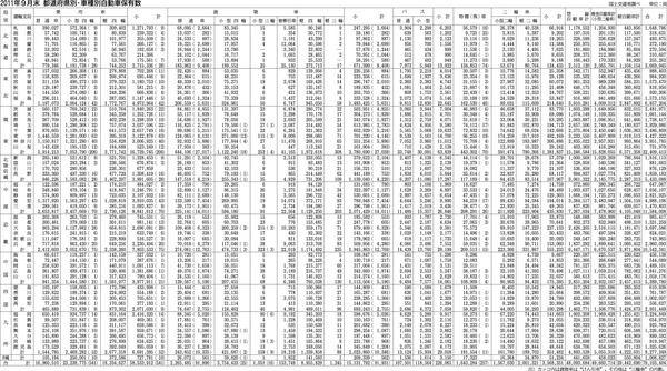 【2011年9月末 都道府県別・車種別自動車保有数】