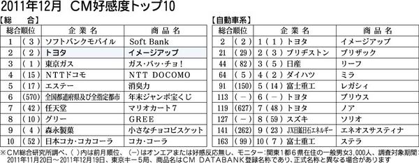 CM総合研究所(関根建男代表)がまとめた12月のCM好感度ランキングは、ソフトバンクモバイルが首位に返り咲き、トヨタ自動車の「イメージアップCM」が前月に引き続き2位となった。3位は東京ガス「ガス・パッ・チョ!」。自動車関係では、ブリヂス...