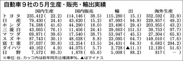 自動車メーカー各社は28日、5月の生産・輸出・販売実績を発表した。輸出を除く全項目で8社中全社が前年同月比でプラス。全面的なプラス基調となった。輸出はダイハツ工業を除く7社が前年同月に対して増加した。2009年5月は経済危機を受けた大幅減...
