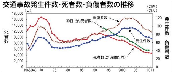 2011年中の交通事故死者数(24時間以内)は前年比252人減の4611人、負傷者数は同4万4114人減の85万2094人となり、死者数は11年、負傷者数は7年連続でそれぞれ減少した。事故発生件数は同3万4866件減の69万907件となり...