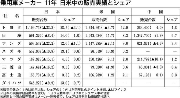 日本の乗用車メーカーによる2011年の日本と米国、中国での販売台数が出そろった。メーカー別では、日産自動車の米国と中国での好調が際立っており、両市場で販売台数を落としたホンダと明暗を分けた。トヨタ自動車は中国での販売を伸ばしたものの、米国...