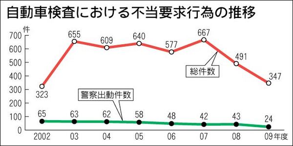 自動車検査独立行政法人(自動車検査法人)は、2009年度に全国の検査場で発生した暴力、脅迫などの不当要求行為の状況をまとめて公表した。不当行為の総数は、前年度に比べ144件減少し、347件だった。これは過去最少の件数。防犯訓練やカメラ、I...