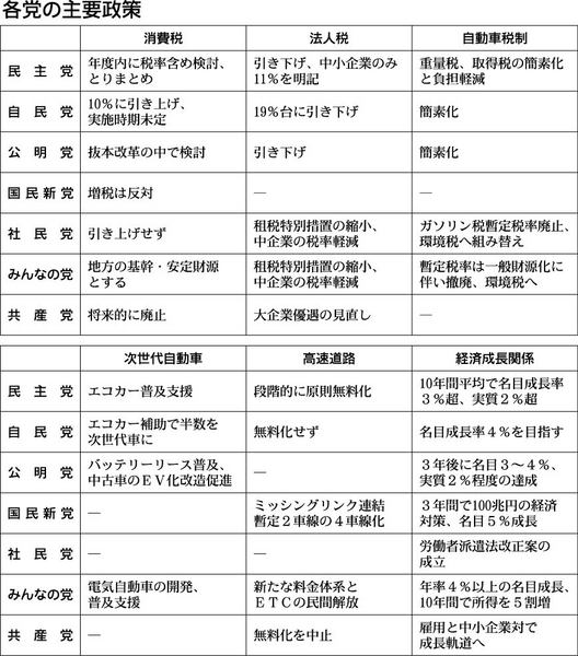 主要政党の参院選マニフェスト、公約などが出そろい、消費税率の引き上げや法人税引き下げを始めとする経済対策、地球温暖化対策など、重要政策をめぐる論戦も激しさを増している。自動車関連政策では、次世代の環境対応車や高速道路料金、関係税制の見直し...