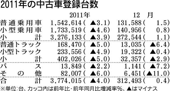 日本自動車販売協会連合会が17日発表した2011年暦年の中古車登録台数(新規、名義変更等の合計)は、前年比4%減の377万4015台だった。2年連続で400万台を下回り、1978年の統計開始以来、過去最低の水準に落ち込んだ。昨年3月の東日...