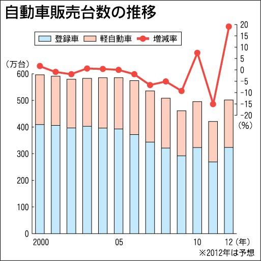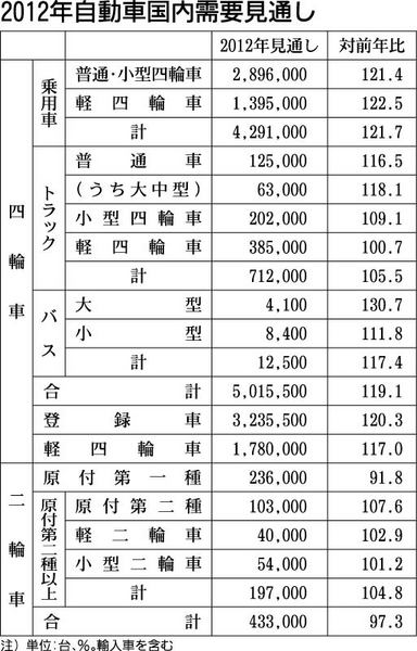 日本自動車工業会(自工会、志賀俊之会長)は18日、四輪車の2012年国内需要見通しを発表した。それによると、登録車が前年比20・3%増の323万5500台、軽自動車が同17・0%増の178万台、合計で同19・1%増の501万5500台とし...