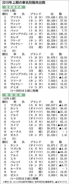 日本自動車販売協会連合会(自販連、天野洋一会長)と全国軽自動車協会連合会(全軽自協、小谷忠幸会長)が6日発表した2010年上期(1~6月)の乗用車車名別販売台数によると、トヨタ自動車のハイブリッド車(HV)「プリウス」(EXを含む)が19...