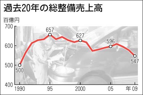 国土交通省は13日、2009年度の「自動車分解整備業実態調査結果」をまとめた。総整備売上高(09年6月時点)は、前年度比5・3%減の5兆4671億円と3年連続のマイナスだった。売上高が5兆5千億円を割り込んだのは19年ぶりで、3年連続の減...