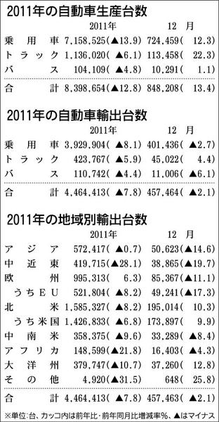 輸出7.8%減、円高が追い打ち 日本自動車工業会(自工会、志賀俊之会長)は31日、2011年の生産・輸出実績を発表した。それによると、国内生産台数は前年比12・8%減の839万8654台となり、2年ぶりのマイナスとなった。東日本大震災やタ...