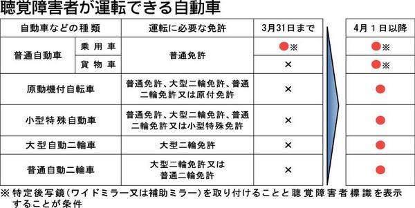4月から重度の聴覚障害者が小型トラックや二輪車を運転できるようになる。警察庁は4月1日に道路交通法の施行規則を改正し、大型自動二輪車免許や普通自動二輪車免許などの適性試験において聴力に関する合格基準を廃止する。また、補助ミラーや「聴覚障害...