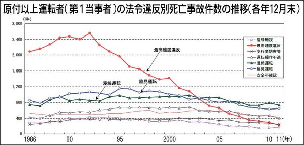 2011年の交通事故発生件数は前年比4・7%(3万3841件)減の69万1932件に減少し、1992年以来19年ぶりに70万件を下回った。近年の死亡事故件数の減少は「危険認知速度(事故直前の車両速度)」の低下が主な要因の一つ。警察庁の道路...