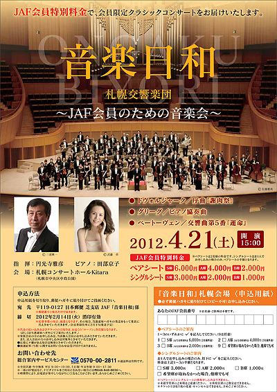 日本自動車連盟(JAF)は4月21日、著名ピアニストの田部京子さんを招き、指揮円光寺雅彦、札幌交響楽団によるフルオーケストラ演奏会を札幌コンサートホールKitaraで開く。会員特別優待料金の提供で、今月14日申し込み締め切り。 曲目はドヴ...