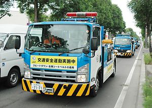 ○…日本自動車連盟(JAF)札幌支部(杉本亙支部長)は21日、札幌市内で「交通安全パレード」を行った。「夏の交通安全運動」(16~25日)に合わせた啓発活動で、同支部では初の試み。 ○…レッカー車とサービスカーの合計5台を連ね、同支部を基...