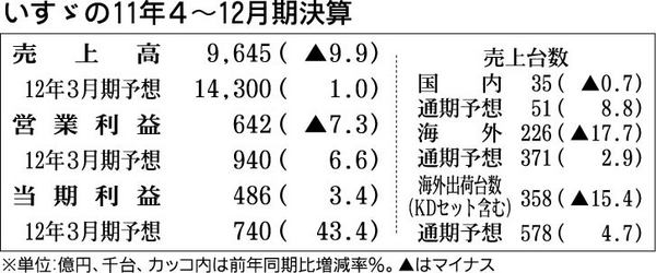 いすゞ自動車が8日発表した2011年4~12月期連結決算は、売上高が前年同期比9・9%減の9645億円、営業利益が同7・3%減の642億円となり2年ぶりの減収・営業減益となった。東日本大震災やタイの洪水などにより、一時的に生産が休止したこ...