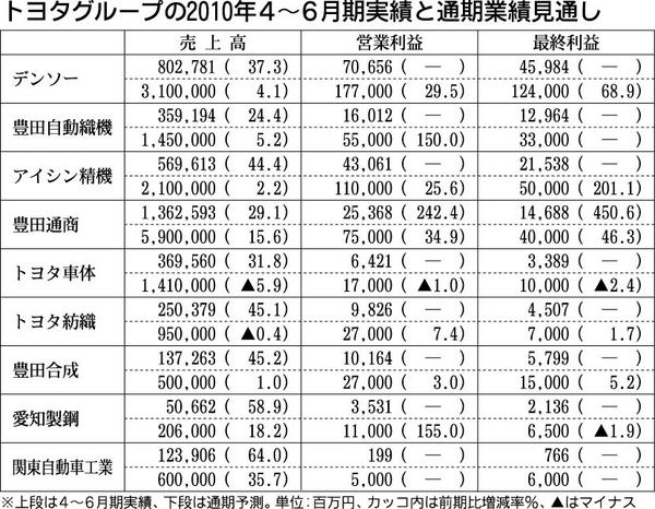 トヨタグループの部品・車体メーカー8社は30日、2010年4~6月期連結業績を発表した。国内外の新車需要で安定した状態が続いたことにより売り上げが増加、加えて合理化努力が進んだことなどから、各社の業績は前年同期と比べて大幅に向上、デンソー...