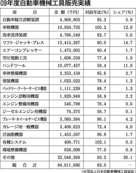 日本自動車機械工具協会、09年度の機械工具販売実績