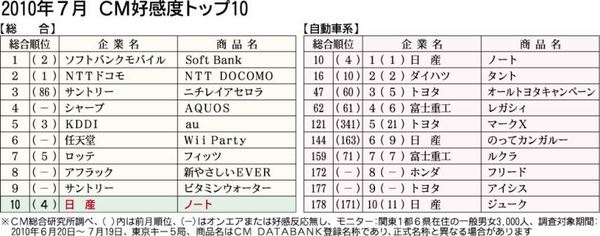 CM総合研究所(関根建男代表)がまとめた7月のCM好感度ランキングによると、ソフトバンクモバイルが首位に返り咲き、NTTドコモが2位と前月から順位が入れ替わった。サントリーの清涼飲料水2種がベスト10入り。自動車業類トップの日産「ノート」...