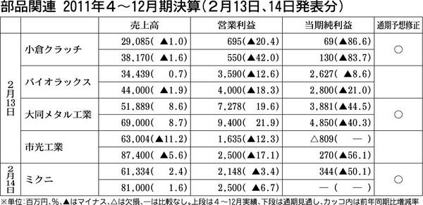 【部品関連 2011年4月~12月期決算(2月13日、14日発表分)】