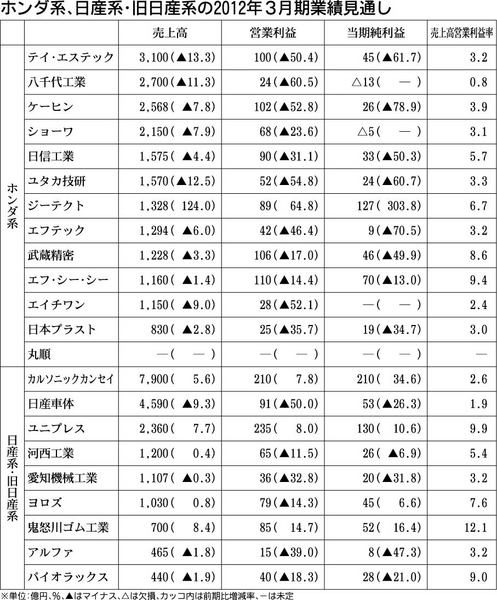 ホンダ系、日産系(旧日産系を含む)の主要な部品・車体メーカーが発表した2012年3月期の業績見通しは、ホンダ系13社のうち12社が減収減益になる一方、日産系の9社では、カルソニックカンセイなど5社が増収、4社が最終増益を確保する。ホンダ系...
