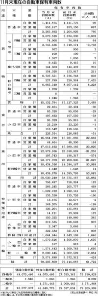 自動車検査登録情報協会(後藤悦治郎理事長)による2011年11月末時点の自動車保有台数は、前月比6万1722台(0・08%)増の7920万5809台で、8カ月連続のプラスだった。新車生産が回復し、登録が順調に進む一方で、東北3県で使用不能...