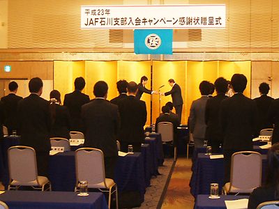 【金沢】日本自動車連盟石川支部(JAF石川、要明英二支部長)は21日、金沢市内のホテルで「平成23年JAF石川支部入会キャンペーン感謝状贈呈式」を開催し、会長賞15社、中部本部長賞1社、支部長賞12社、支部長賞個人部門9人、販売店別優秀社...