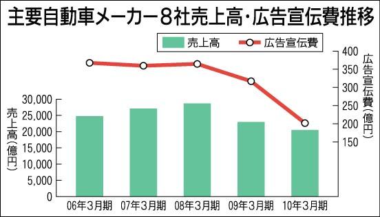 信用調査会社の東京商工リサーチによると、国内自動車メーカー8社(大型車を除く)の2010年3月期の広告宣伝費は2013億円で5年前の06年3月期の3682億円に比べ46・5%減とほぼ半減した。8社中5社が売上高がここ5年で最高だった08年...