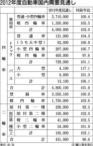 日本自動車工業会(自工会)は15日、2012年度の国内自動車需要予測を発表した。四輪車需要は、11年度の推定台数を471万1400台としたうえで、12年度の見通しは前年度比1・9%増の480万100台とした。増加は2年連続となるが、増加率...
