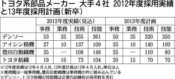 デンソーなどトヨタ系部品メーカー4社は15日、2013年度(新卒、13年4月入社)の定期採用計画を発表した。デンソーは12年度(12年4月入社)に対して49人減の755人、アイシン精機は同2人増の285人、豊田自動織機は同66人減の225...
