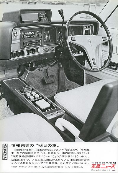 日本のITS(高度道路交通システム)開発は世界でも早かった。写真は当時の通産省による実験風景。インパネの上に載る車載器に渋滞情報などが表示され、経路誘導も行われた。約40年後の今、ETCやテレマティクス、VICSが普及するITS大国になっ...
