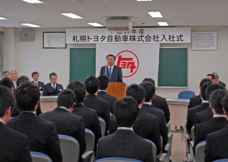 道内の新車ディーラー各社は1、2日、一斉に入社式を開催した。保有ビジネス強化の傾向を反映し、新入社員の6割がメカニック。今年の道内新車ディーラー新卒採用は前年比2割増の530人前後とみられる。 札幌トヨタは、本社会議室で開催。石本康平社長...