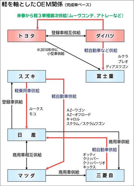 トヨタ自動車がグループのダイハツ工業から軽自動車のOEM(相手先ブランドによる生産)供給を受けることで、国内メーカー間のOEM関係がさらに広がる。軽自動車をめぐっては、スズキがマツダと日産自動車に、三菱自動車が日産に車両を供給している。一...