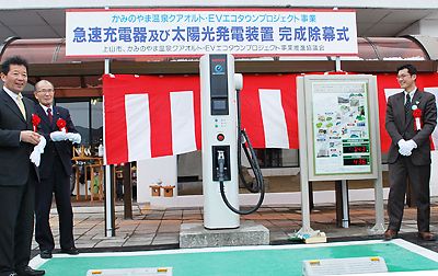かみのやま温泉を抱え、自然療法による治療を目的とした来訪者を増やそうと長期滞在型の保養地(ドイツ型のクアオルト)実現を目指す上山市は、市庁舎前に設置した電気自動車(EV)向け急速充電器とソーラーパネルの除幕式を3月27日に開催した。 急速...