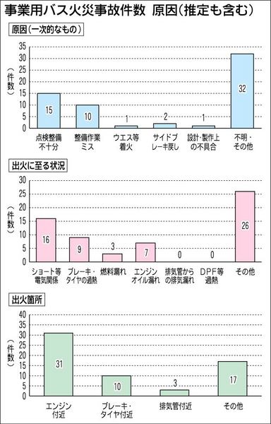 国土交通省は事業用(緑ナンバー)バスで起きた火災事故の分析結果をまとめた。原因は点検を怠ったり、整備作業を誤るなど点検整備に起因する割合が高く、“火元”は電気系の短絡(ショート)やブレーキ・タイヤの過熱が多いことがわかった。同省は分析結果...
