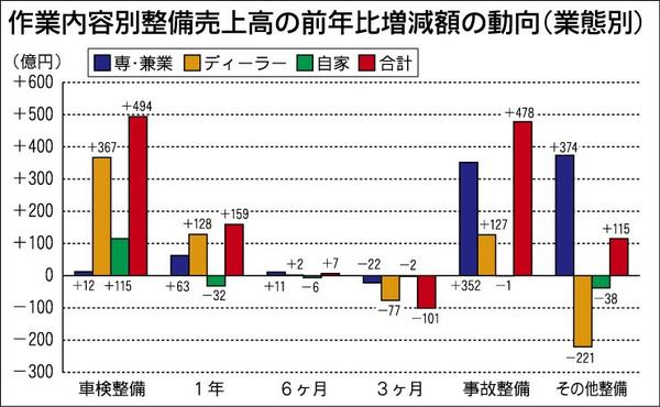 総整備売上高 兼業除き増加、入庫台数は減少も単価は増 日本自動車整備振興会連合会(日整連、坪内恊致会長)がまとめた2011年度版の「自動車整備白書」によると、総整備売上高は前年比2・1%増の5兆6021億円と2年連続で増加し、ゆるやかながら...