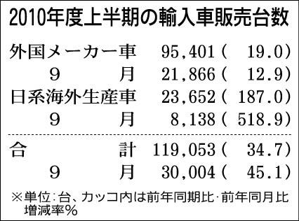 日本自動車輸入組合(JAIA、ローランド・クルーガー理事長)が6日発表した2010年度上半期(4~9月)の輸入車新規登録台数は前年同期比34・7%増の11万9053台で3年ぶりに前年度上半期実績を上回った。上半期としては1990年度上半期...