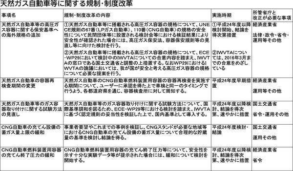 天然ガス自動車などのガス自動車の規制緩和が実現しそうだ。燃料容器の基準を国際基準に合わせるとともに、燃料容器検査と車検の整合性を図るなどでCNG(圧縮天然ガス)自動車、先進LPガス自動車などのガス自動車の普及基盤が整備される。自動車燃料の...